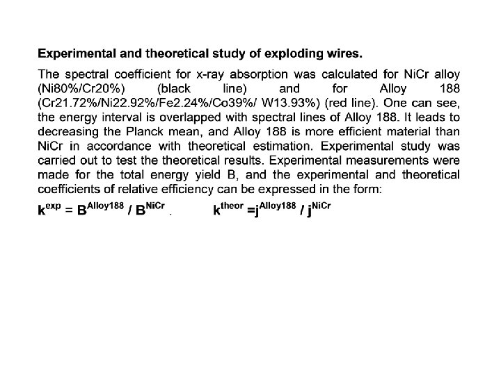 Fig. 1. The spectral coefficient for X-rays absorption K(x) (cm 2/g) calculated for alloy (Ni 80%/Cr 20%) (black line) and for the composition Alloy 188 (Cr 21. 72%/Ni 22. 92%/Fe 2. 24%/Co 39%/W 13. 93%) (red line) at the temperature T=1 ke. V and the density