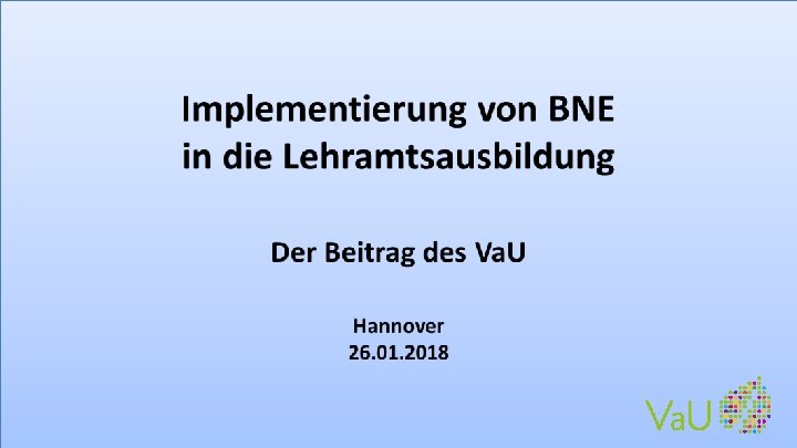 Baukasten: Elemente des Transfers von BNE-Kompetenzen des Va. U in die universitäre Lehrerbildung Individuelle Beratung von Fachdidaktiker/innen Seminare der Hochschuldidaktik (Fach & Fachdidaktik) Fachbezogene Seminare für Lehramtsstudierende Wie kann BNE in einzelne Module/Seminare/Praktika etc. integriert werden? (1. Phase) Wie lässt sich Hochschullehre durch Inhalte und Konzepte der BNE weiterentwickeln? (1. Phase) Wie kann ich BNE in meiner zukünftigen Tätigkeit als Lehrkraft der Biologie, Geographie, … umsetzen? Seminare im überfachlichen Teil der Lehrerbildung Wie kann BNE ein Teil meiner „soft skills“ im Lehrerberuf werden? (1. Phase) Lehrerfortbildung (auch für Fachleiter/innen) Wie kann ich BNE in meine aktuelle Berufspraxis integrieren? (2. und 3. Phase) … weitere Elemente sind denkbar