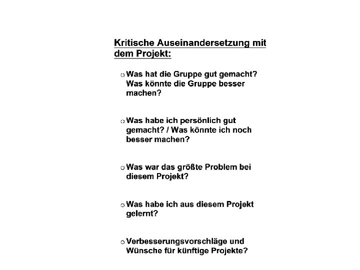 Inhaltsverzeichnis (Vorschlag!!) 1. Die Aufgabenverteilung………. …………………………………. . . … S. 3 1. 1 Aufgabenverteilung zu Beginn des Projekts……………………. S. 3 1. 2 Neue Aufgabenverteilung im Laufe des Projekts……………………. . S. 4 (Ihr werdet sehen, dass im Laufe des Projekts neue Aufgaben hinzukommen) 2. Ergebnisse……………………………………………. ………S. 5 2. 1 Eigene Datenerhebung………………………………………. . …S. 6 (z. B. durch Fragebögen und Experimente) 2. 2 Auflistung der Quellen………………………………………… S. 7 (=Zitate!!!!) 2. 3 Eigenes Fazit ………………………………………………. . S. 9 (= zusammenfassend zieht ihr eine Bilanz eurer Ergebnisse, benennt z. B. Widersprüche) 3. Persönliche Bewertung der Projektarbeit…………………………. … S. 10 3. 1. Bewertung der Gruppenleistung (Wie hat die Gruppe funktioniert? )……………. S. 10 3. 2. Bewertung der eigenen Leistung (Was habe ich gut /nicht so gut gemacht) …. S. 10 3. 3. Persönlicher Gewinn (Was habe ich im Projekt gelernt? ). . . . S. 11 3. 4. Verbesserungsvorschläge für künftige Projekte………………………. . . S. 11 4. Quellenverzeichnis (Literatur, Quellen aus dem Internet) ……………. S. 12