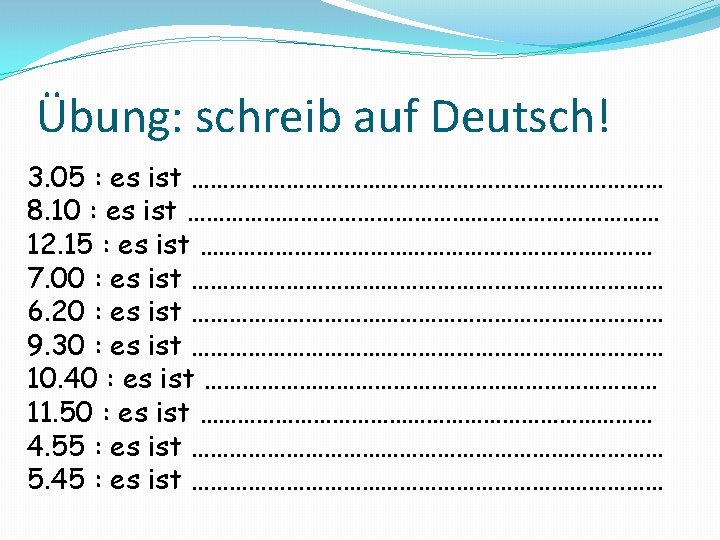 2. 00 3. 40 5. 15 7. 10 11. 55 4. 45 9. 05 1. 30 • • Verbinde! • Es ist fünf nach neun. • Es ist zehn nach sieben. • Es ist halb zwei. • Es ist zwei Uhr. • Es ist Viertel nach fünf. • Es ist zwanzig vor vier. • Es ist Viertel vor fünf. • Es ist fünf vor zwölf.