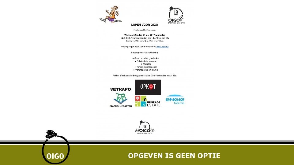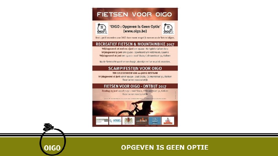 Kalender 2017 21 mei stadsloop - Gent 26 mei/2 -9 -16 juni Fietsen voor OIGO 25 juni ONTBIJT fietsen voor OIGO 4 -5 augustus Koersen voor OIGO 1 september : concert voor OIGO ( 10 jaar ! ) 3 september Motoren voor OIGO 17 september Wandelen voor OIGO – Waregem