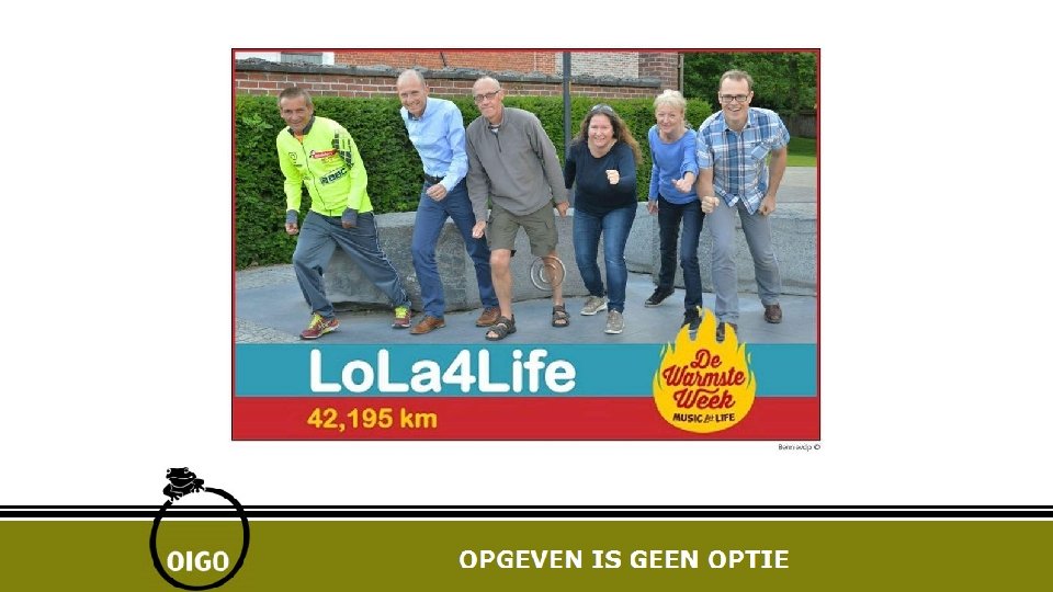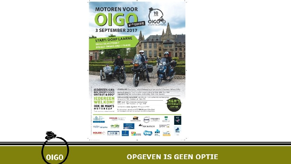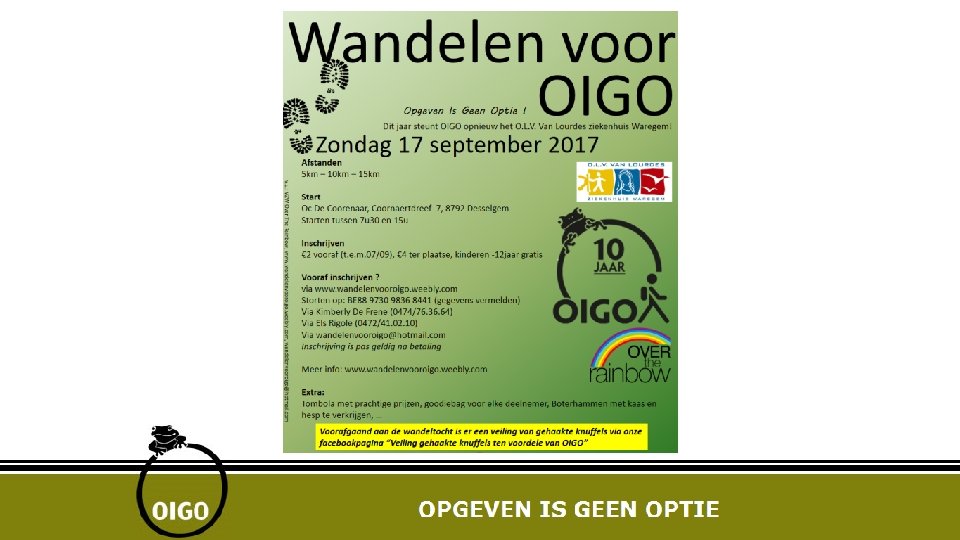 Wie zijn wij (2) Wat begon als het organiseren van een éénmalig evenement is uitgegroeid tot een VZW die dit jaar 10 jaar bestaat. VZW OIGO telt 11 bestuursleden (onbezoldigd) bijna allemaal mensen uit Laarne-Kalken. Jaarlijks worden er evenementen georganiseerd • • Lopen voor OIGO Fietsen voor OIGO Motoren voor OIGO Wandelen voor OIGO