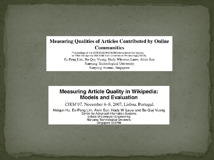 Evaluation �Use a set of articles on countries that have been assigned quality labels by Wikipedia’s Editorial team �Preprocessing: � Bot revisions were removed from the analysis. � Consecutive edits by a user were removed and final edit was used.