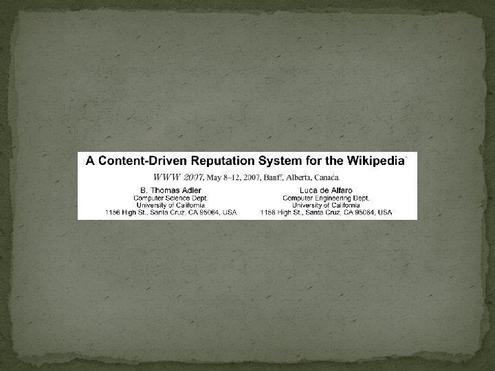 Summary �Propose a content-driven reputation system for authors �Authors gain reputation when their work is preserved by subsequent authors and lose reputation when edits are undone or quickly rolled back �Evaluation: Low-reputation authors have larger than average probability of having poor quality as judged by human observers and are undone by later editors