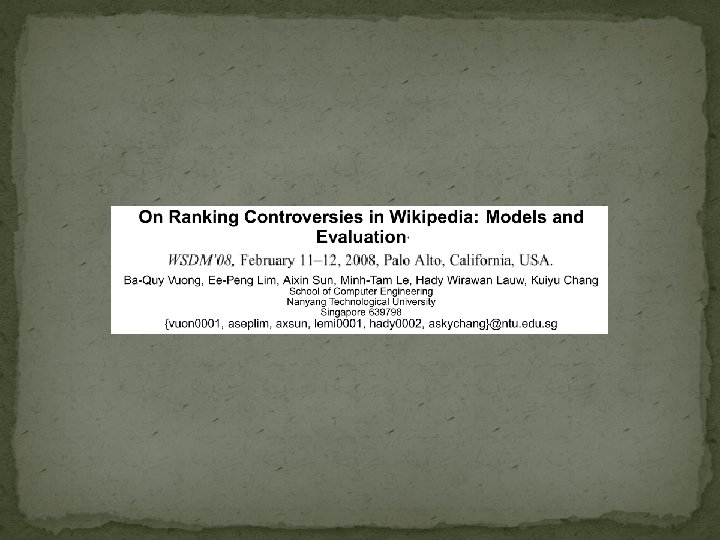 Summary �A different question: What are the controversial articles? �Uses edit and collaboration history �Two Models: Basic and Contributor Rank �Contributor Rank model tries to differentiate between disputes due to the article and those due to the aggressiveness of the contributors, with the former being the one that is to be measured �Evaluation: Identification of labeled controversial articles