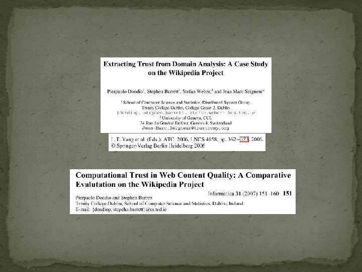 Summary �Propose the use of a trust tab in Wikipedia �Link-ratio: Ratio between the number of citation and the number of non-cited occurrences of the encyclopedia term �Evaluation: compare link ratio values for featured, normal and clean-up articles