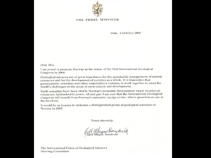 Citations from the PM letter : • ”I am proud to promote Norway as the venue of the 33 rd International Geological Congress” • ”Geological sciences are of great importance for the sustainable management of resources and the development of societies as a whole” • ”Earth scientists have been vital to Norway’s economic development based on mineral resources, hydroelectric power, oil and gas”