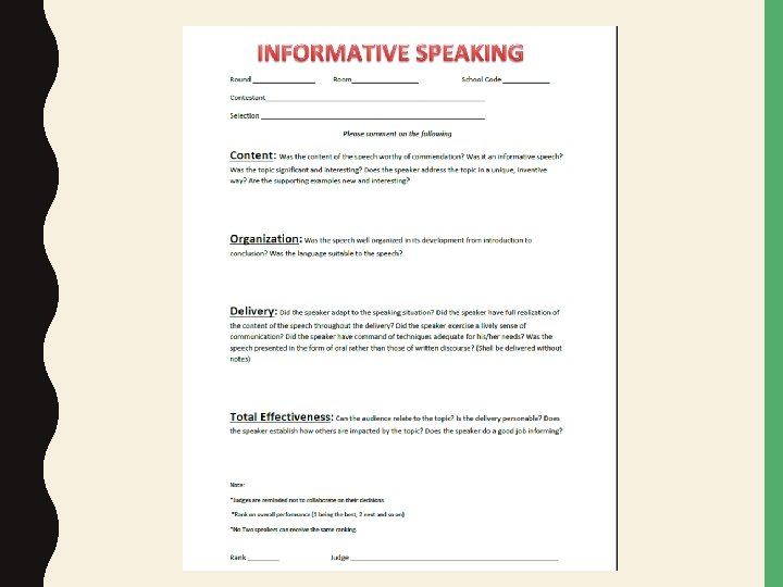 INFORMATIVE SPEAKING • Description – An 8 -10 minute informative speech. – Written by the student – Students do not have to perform in order. • What to Look For Does the Speaker… – Inform you. – Use stories, examples, and quotes effectively. – Have good delivery and content. – They may use visual aids