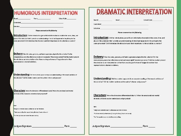 HUMOROUS & DRAMATIC INTERPRETATION • Description – 8 -10 minute performance – Cut from a published source, (play, book, etc. ) – Creative development of characters. – No costumes, props, or other visual aids. • What to Look For Does the speaker… – Have developed characters. – Convey a clear understanding of the literature, & is the performance appropriate for the selection. – Introduce and establish important information.