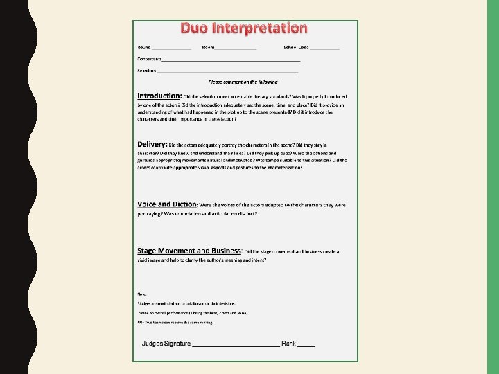 DUO INTERPRETATION • Description • What to Look For – 8 -10 minute performance of Do the Speakers… published material. – – Humorous or Dramatic No prop or costumes. Limited movement. Off-stage focus – Have developed characters. – Convey a clear understanding of the literature, & is the performance appropriate for the selection. – Introduce and establish important information.