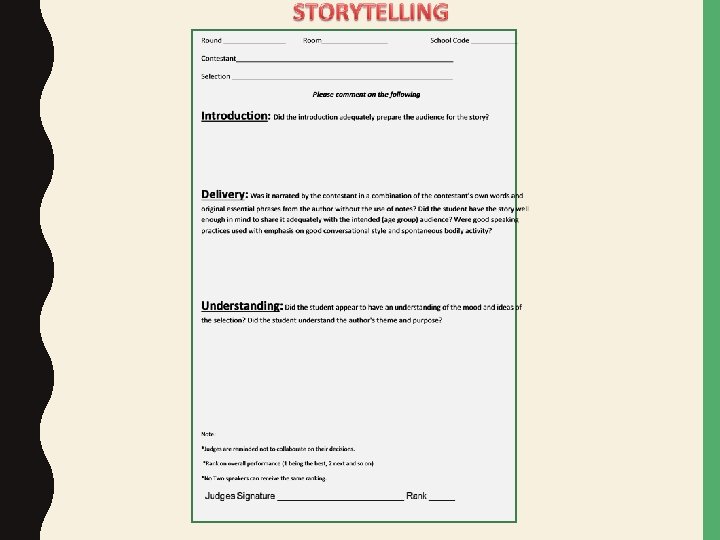 STORY TELLING • Description • What to Look For – 6 -8 minute performance of published material. – The story shall be told from a Does the speaker… seated position on a chair. – Convey a clear understanding of the literature, & is the – Narrated by the contestant in performance appropriate for the a combination of the selection. contestant’s own words and original essential phrases – Display good eye contact and from the author without the facial expression use of notes. – Introduce and establish – Limited movement. important information.