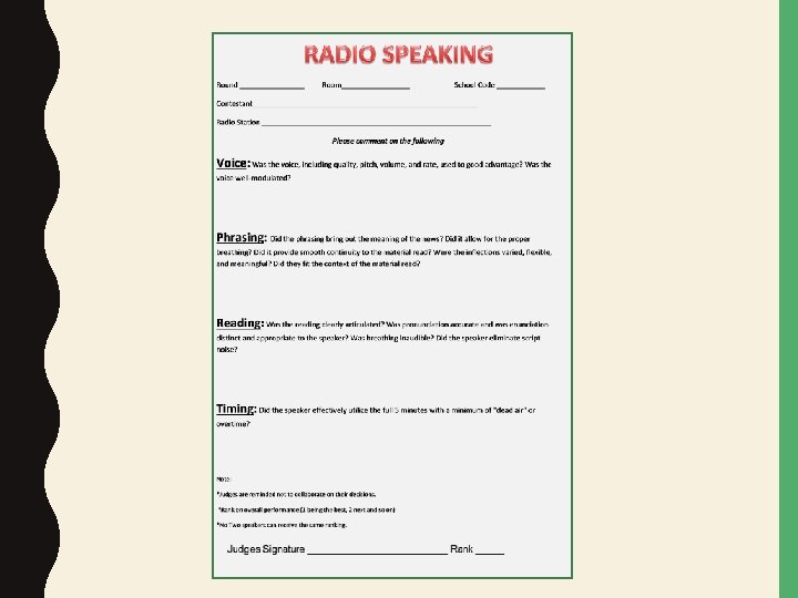 RADIO SPEAKING • Description • What to Look For Does – Not more than full 5 minutes with a minimum of "dead air". – Prepare and present a script which contains news, weather and sports. Copy used to prepare the script shall be no more than 24 hours old – No commercials may be used. – The contestant will have their back to the judge. the speaker… – The contestant's voice shall be pleasing when heard on radio. – The contestant’s articulation should be clear; enunciation distinct and pronunciation accurate. – The student's voice, including quality, pitch, volume, modulation and rate, should be used to good advantage. – The individual should have an understanding of the material read.
