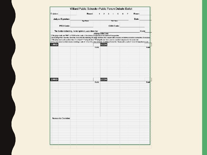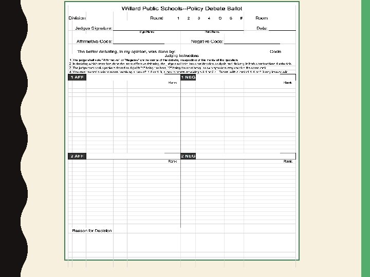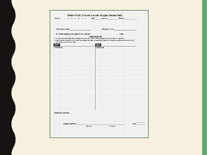 JUDGING DEBATE EVENTS • Each Debate Round you will watch 1 Policy Debate, 2 Lincoln Douglas Debates, or 2 Public Forum Debates. • There will be an Affirmative and a Negative Team for each debate. • Each debate team will have a code, it is very important that your decision match the proper code. • You will have 1 ballot for each debate you watch in the round. • You may make comments and suggestions on the ballot. • After watching a full debate you will give one team a win, no ties. • Following the round return your ballots to the Ballot Return table • Please judge the debate regardless of the merits of the resolution.