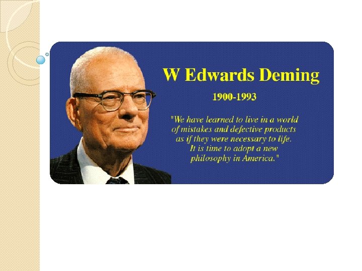 William Edwards Deming v Estadístico estadounidense v Profesor universitario v Autor de textos v Calidad, productividad, y posición competitiva v La salida de la crisis v La nueva economía para el gobierno, la industria y la educación v Consultor v Difusor del concepto de calidad total. 14 de octubre de 1900 20 de diciembre de 1993