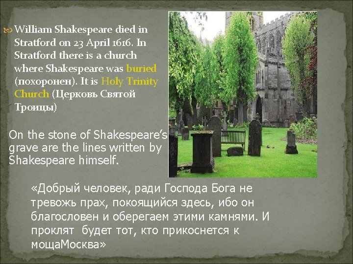 A Place of Birth William Shakespeare was born in Stratfordupon-Avon. It is a very interesting town in the central part of England. Around Stratford there are beautiful forests, green fields (поля) and a little river – Avon.