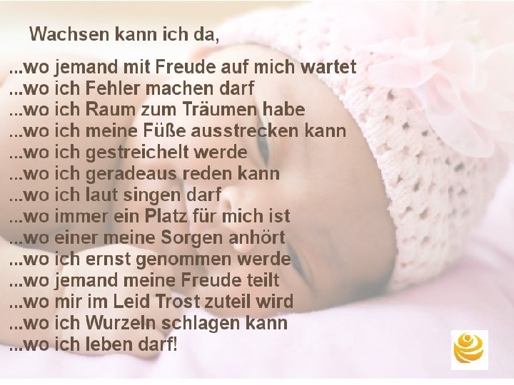 Schwangerschaft • Mutter und Kind sind über die Nabelschnur verbunden. Das Kind wird so genährt, nicht nur mit Nahrung sondern auch durch äussere Einwirkungen. z. B. emotionaler Stress, Übersäuerung durch Ernährung, Gedanken, Medikamente, Mangel an Mineralien und Vitaminen im Körper. • Der Entstehungsprozess kann gestört oder unterbrochen werden und dadurch eine Fehlentwicklung eines einzelnen Organs oder einer ganzen Körperregion hervorrufen. • Durch die craniosacrale Arbeit können wir das Geschehene nicht ungeschehen machen. Wir können aber bei diesem Unterbruch „andocken“ und einen Heilungsprozess in Gang setzen und damit den Entwicklungsprozess positiv unterstützen. Die Selbstheilungskräfte bei Mutter und Kind können sich wieder voll entfalten.