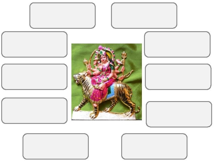 This is the Hindu Goddess, Durga. A Durga murti (statue) often shows the goddess in red or purple clothes. These colours are a sign of action. There are many stories of Durga in which she rides on her tiger to fight evil. She is always busy defending what is good against evil enemies. What do you believe is a weapon for goodness in a world of evil?
