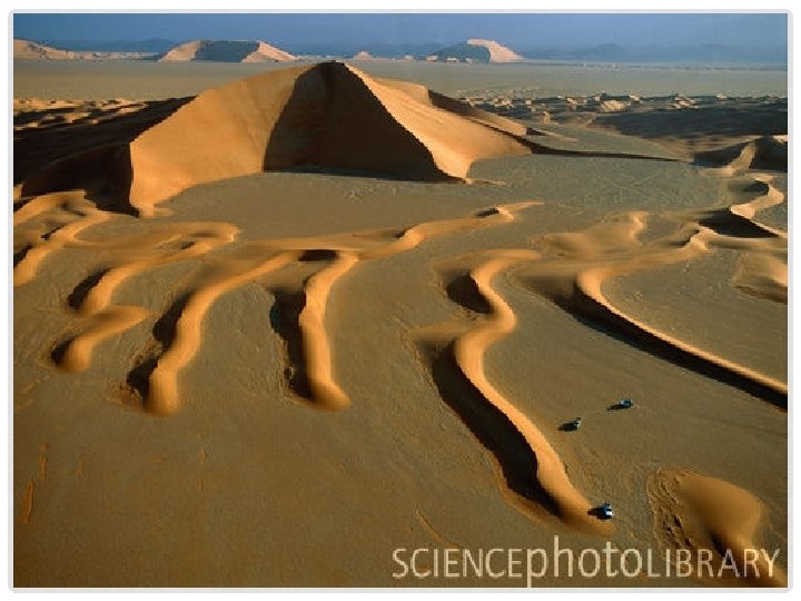 WIND EROSION AND TRANSPORT • Wind cant carry particles as large as those transported by water • Ability of wind to erode materials is less than that of other agents (i. e. water and ice) • Suspension: method of transport by which strong winds cause particles to stay airborne for long distances • Saltation: causes bouncing motion (sand transport)