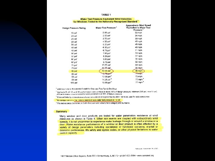 Water Intrusion Testing (continued) n On November 28, 2005 AAMA published a statement entitled” Storm-Driven Rain Penetration of Windows and Doors” u u The purpose of the document is stated as follows: “In the aftermath of tropical storms and hurricanes, questions have been raised by some residents who experienced winddriven rain leaking through or around their windows and doors that otherwise remained unbroken and structurally intact during these extraordinary events. AAMA has chosen to publish this document in order to provide information to homeowners, distributors, and builders as well as code officials regarding water penetration during severe wind-driven rain events. ” AAMA states “Water resistance performance of a window or door product is often affected by a variety of design parameters, including operational or functional concerns, market or economic preferences, life safety and egress codes, or other physical limitations to water control capacity. ” They further include a table (illustrated in the next slide as Table 1) that compares: « Design Pressure « Water Test Pressure, based on 15% of Design Pressure « Approximate Wind Speed equivalent to the test pressure « They further note that although 15% of design pressure is listed as “test pressure required”, Building Codes cap the required test pressure at a maximum of 12 psf. Let’s look at Table 1 in the next slide.