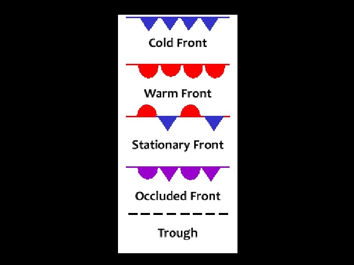 Stationary Front • a front between warm and cold air masses that is moving very slowly or not at all. Ocluded Front • a composite front formed when a cold front overtakes a warm front and forces it aloft.