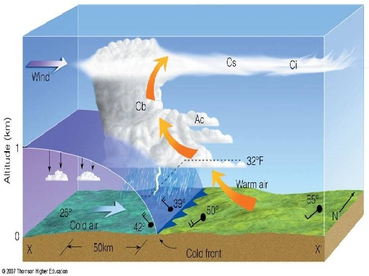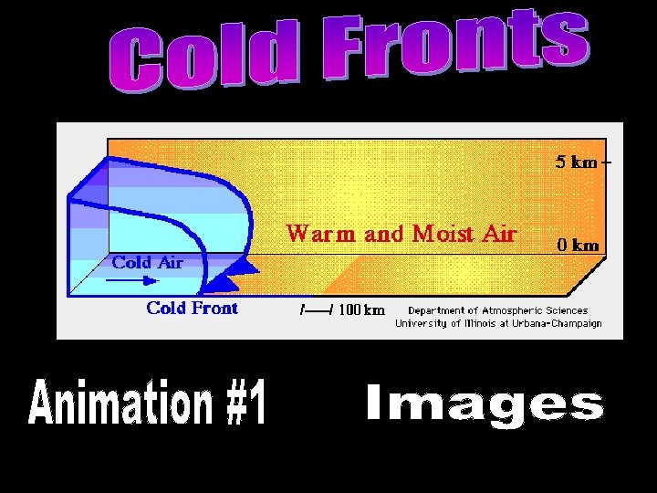 COLD FRONT • When a cold air mass catches up a warm air mass, the cold air slides under the warm air and pushes it upward, as it rises, the warm air cools rapidly.