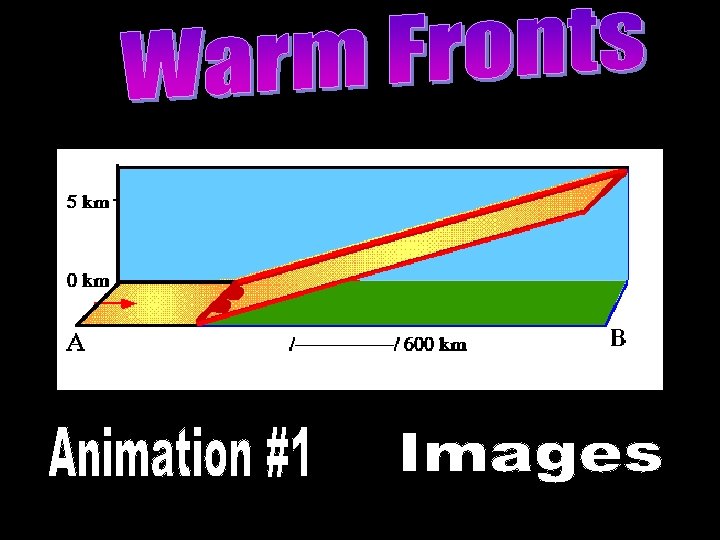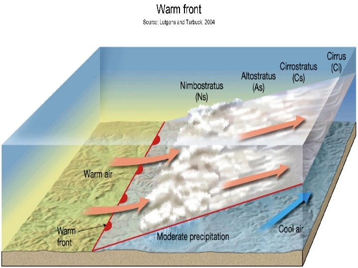 WARM FRONT • When a warm air mass meets a cold air mass, the warm air rises since it is lighter, at high altitude, it cools and the water vapor contained condenses.