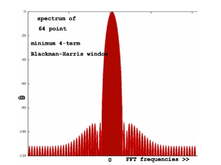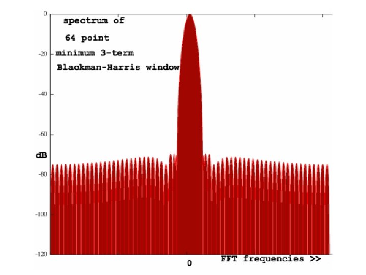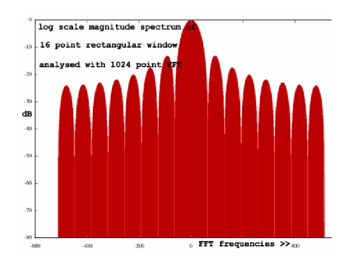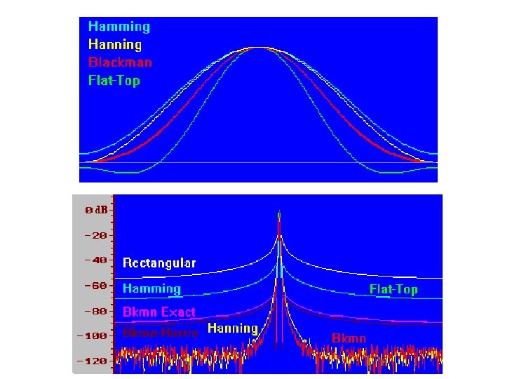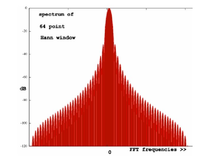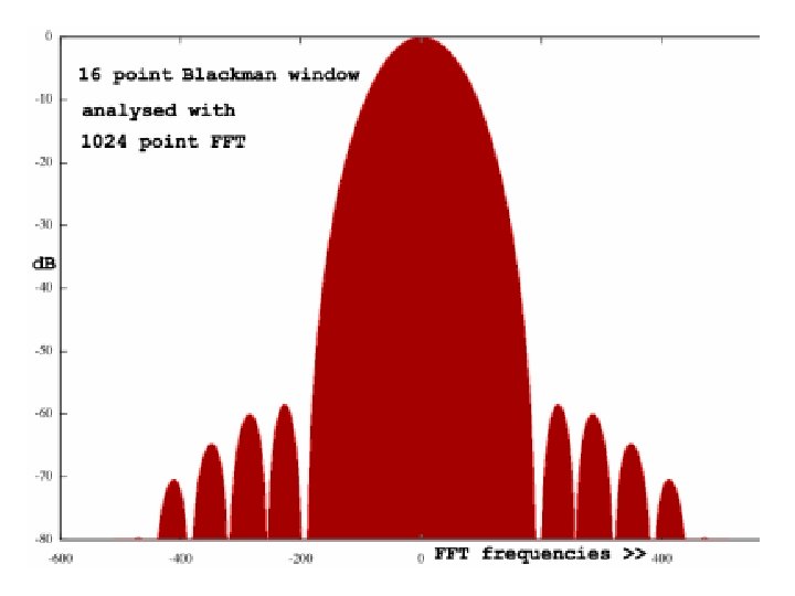 Windowing Formulae • • • Hanning: w[n] = 0. 5 -0. 5 cos(2πn/(N-1)) Hamming: w[n] = 0. 54 – 0. 45 cos(2πn/(N-1)) Bartlett: w[n] = 2/(N-1)/2 - |(n–(N-1)/2|) Triangle: w[n] = 2/N. (N/2 - |(n–(N-1)/2|) Blackman: w[n] = a 0 – a 1 cos(2πn/(N-1)) – a 2 cos(4πn/(N-1)) where: a 0 = (1 -α)/2 ; a 1 = ½ ; a 2 = α /2; α =0. 16 • Blackman-Harris: w[n] = a 0–a 1 cos(2πn/(N-1))–a 2 cos(4πn/(N-1)) - a 3 cos(6πn/(N-1)) where: a 0=0. 35875; a 1=0. 48829; a 2=0. 14128; a 3=0. 01168 Note: Small formula changes can cause large frequency response differences