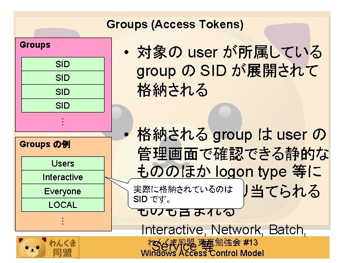 ちょいと予備知識 (SID について) Account (user, group) は Windows 内部では ID を使って管理している。 その ID を SID (Security Identifier)と呼ぶ。 SID の例 SID Name S-1 -1 -0 Everyone S-1 -3 -0 Creator Owner S-1 -5 -18 Local System S-1 -5 -19 Local Service S-1 -5 -20 Network Service S-1 -5 -21 -xxxxxxxxx-xxxxx-512 Domain Admin この部分は domain (computer) 固有の ID が付与される Well-known SID と呼ばれる Domain Admin を表す わんくま同盟 東京勉強会 #13 Windows Access Control Model