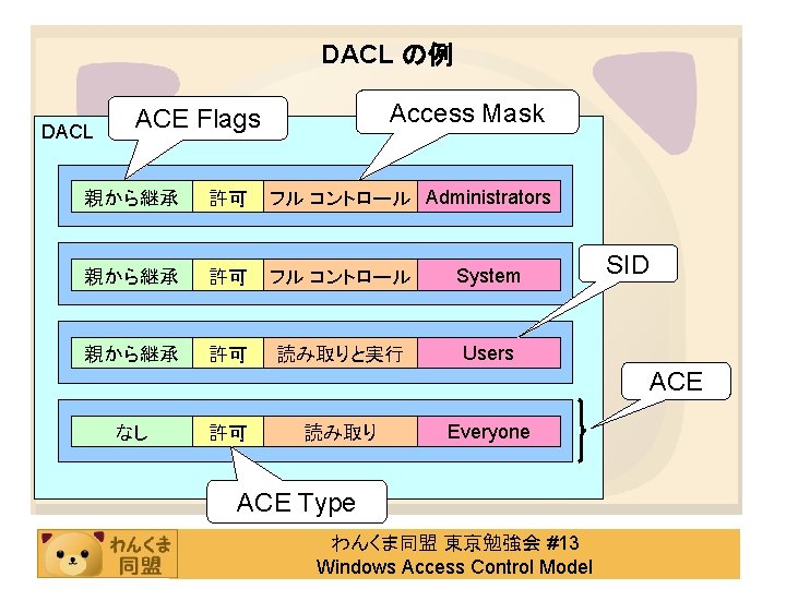 ACL と ACE の内部構造 • ACL (Access Control List) ACL ACE ACE … ACE Flags ACE Type Access Mask SID – SID 毎の entry である ACE の集合 • ACE (Access Control Entry) – 対象への操作を制御する SID 毎の entry • ACE Flags – Object の種類、継承および監 査を制御 わんくま同盟 東京勉強会 #13 • ACE Type Windows Access Control Model