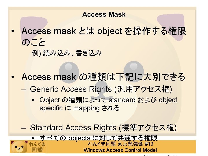 Standard Access Rights 権利 日本語表記 (file) 説明 DELETE 削除 削除 READ_CONTROL アクセス許可の読み取り Security descriptor の読み込 み SYNCHRONIZE - 同期 WRITE_DAC アクセス許可の変更 WRITE_OWNER 所有権の取得 STANDARD_RIGHTS_ALL - 他の権利の論理和 (SYNCHRONIZE 含む ) STANDARD_RIGHTS_EXECUTE アクセス許可の読み取り = READ_CONTROL STANDARD_RIGHTS_READ アクセス許可の読み取り = READ_CONTROL STANDARD_RIGHTS_REQUIRED STANDARD_RIGHTS_WRITE アクセス許可の読み取り 他の権利の論理和 (SYNCHRONIZE 含まない ) = READ_CONTROL わんくま同盟 東京勉強会 #13 Windows Access Control Model