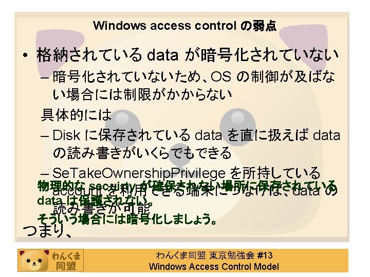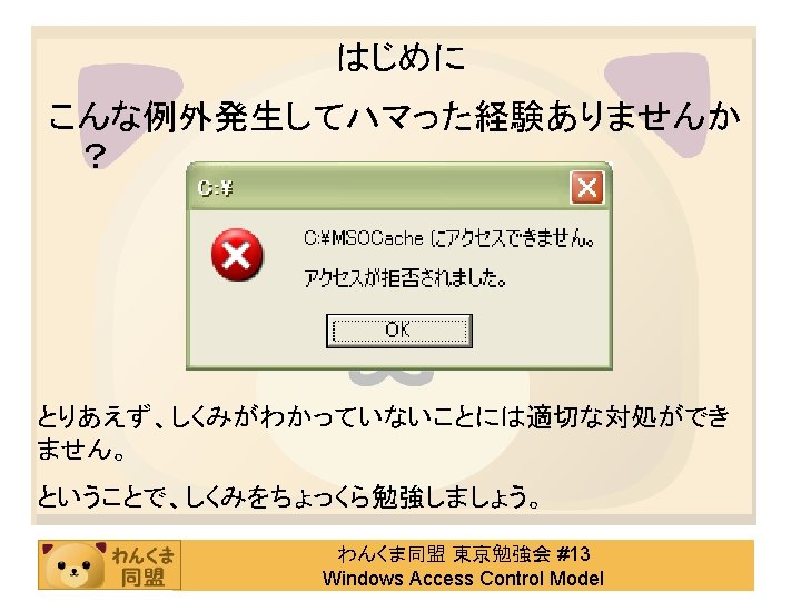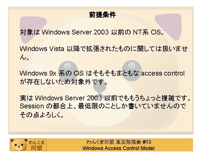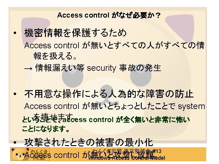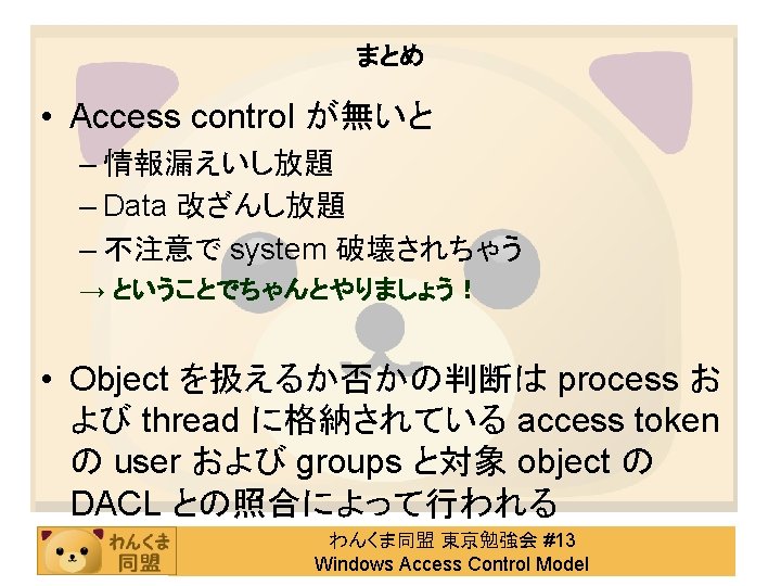 Tools • Windows XP SP 2 Support Tools – whoami. exe (2003 から標準搭載) – xcacls. exe (Vista 以降ではより高機能の icacls. exe が利用可能) • Windows Server 2003 Resource Kit Tools – subinacl. exe (高機能) Sys. Internals suite でまとめて導入をお勧め • Sys. Internals 全て Microsoft の Web site から download できます。 – Process Explorer わんくま同盟 東京勉強会 #13 – Process Monitor. Windows Access Control Model