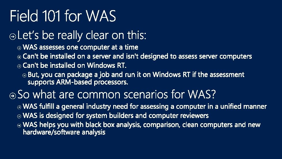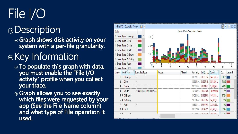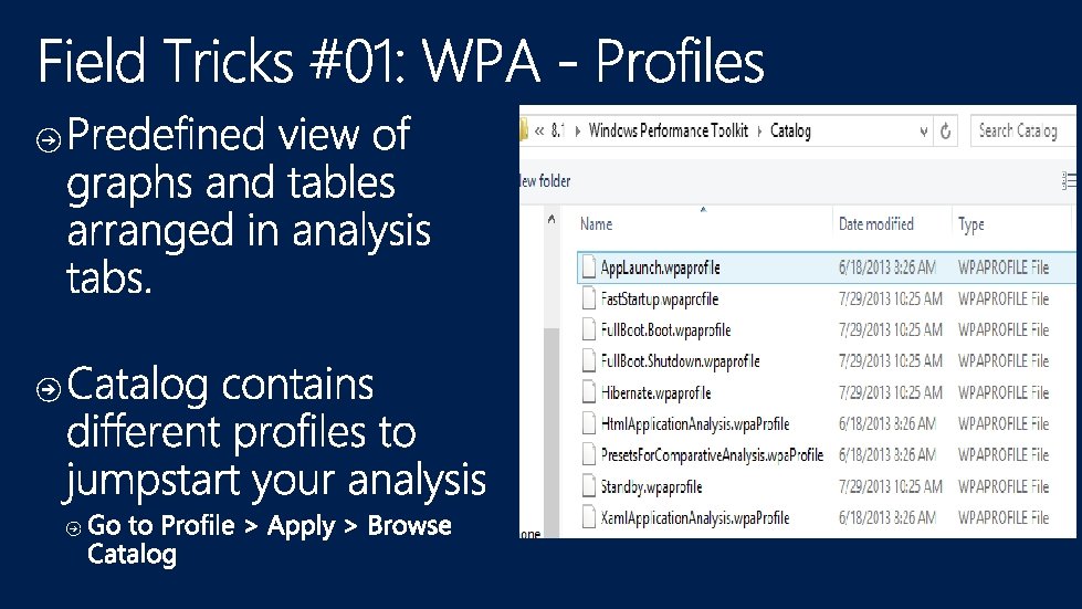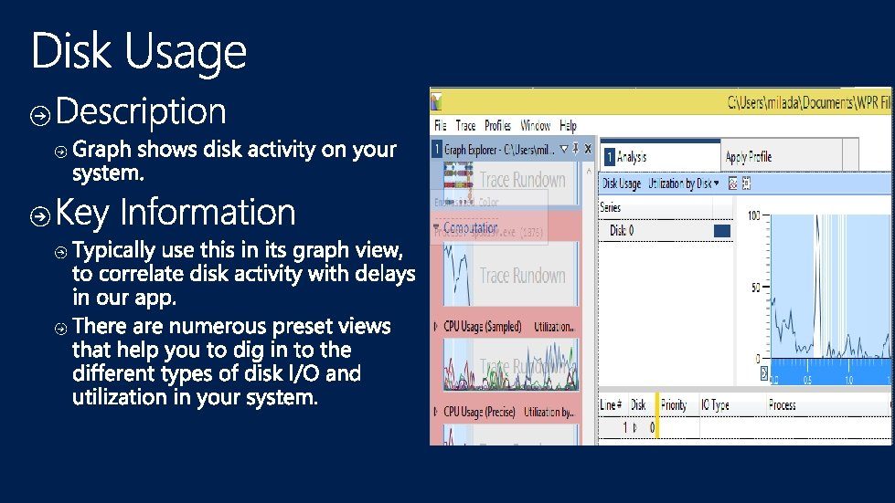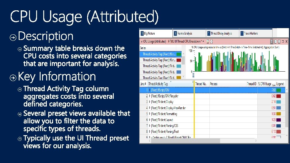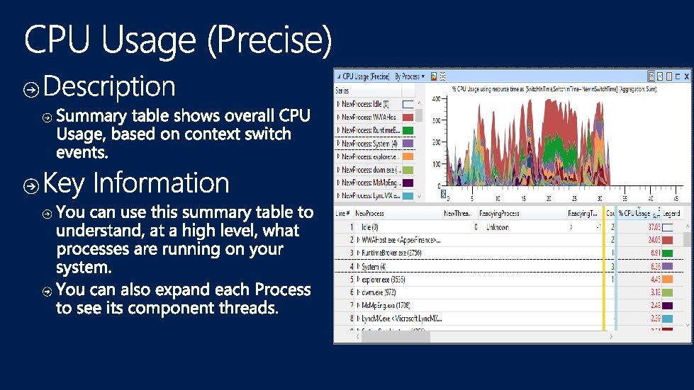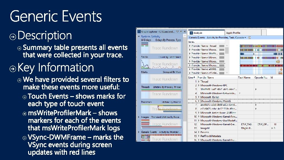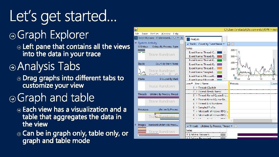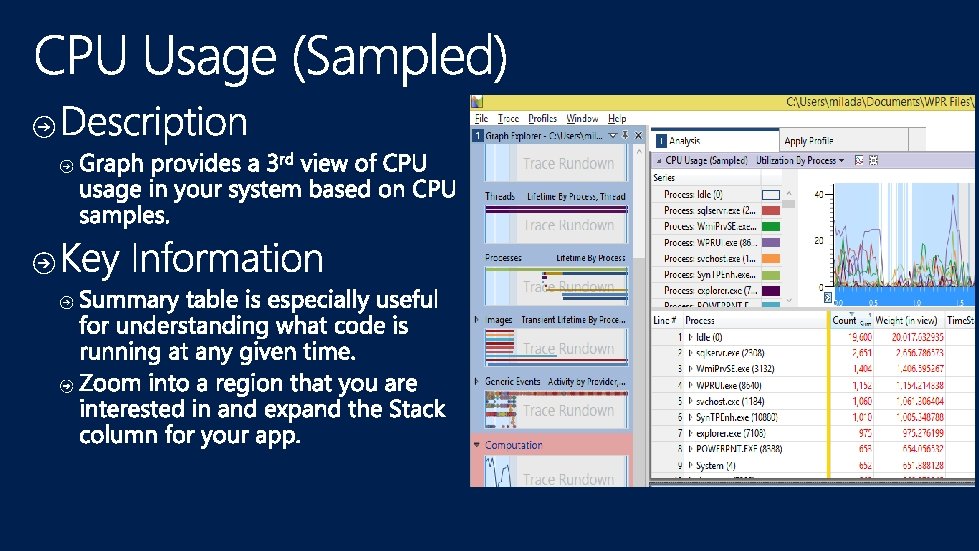 Analysis Perfmon Debug. Diag/ Adplus/ Proc. Dump Visual Studio Windows Performance Toolkit Basic analysis Y N Advanced analysis N Y Analysis of apps/services Y Y Analysis of drivers N N - Y Trace capture & export Y Y N Y Reopen shared/post mortem traces Y Y N Y Source code linking N Y Y N Y