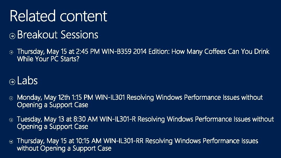 http: //aka. ms/download. SDK/ http: //aka. ms/perftools/ http: //msdn. microsoft. com/enus/library/windows/hardware/hh 448108. as px http: //msdn. microsoft. com/enus/library/windows/desktop/bb 968803(v=v s. 85). aspx/ http: //msdn. microsoft. com/enus/library/windows/desktop/hh 448223. asp x http: //msdn. microsoft. com/enus/library/windows/hardware/hh 448242. as px Let us know your feedback! By going to the WPT forum