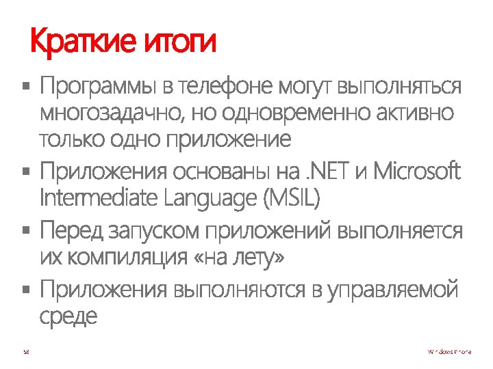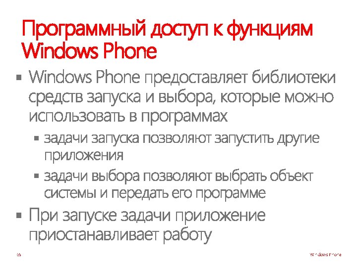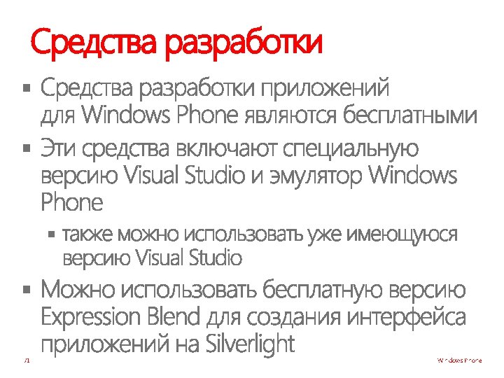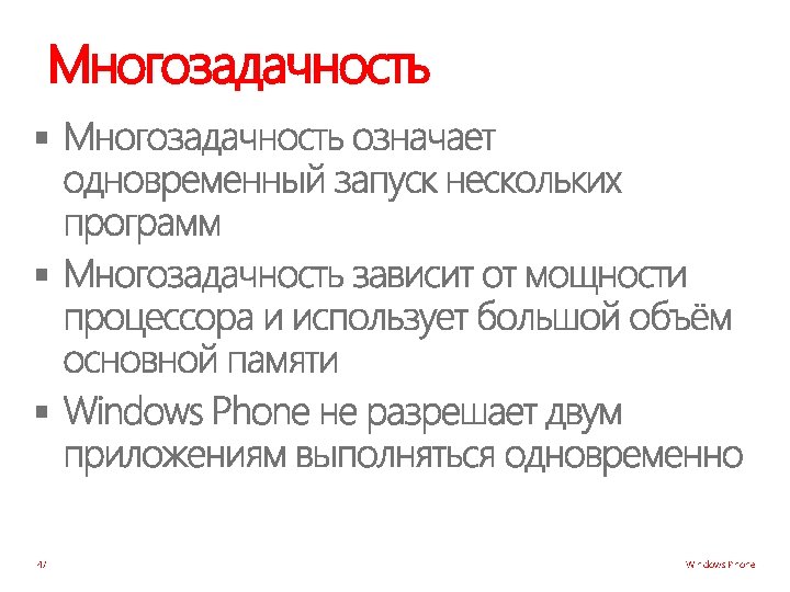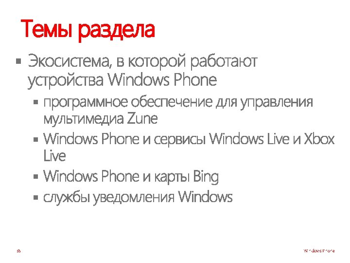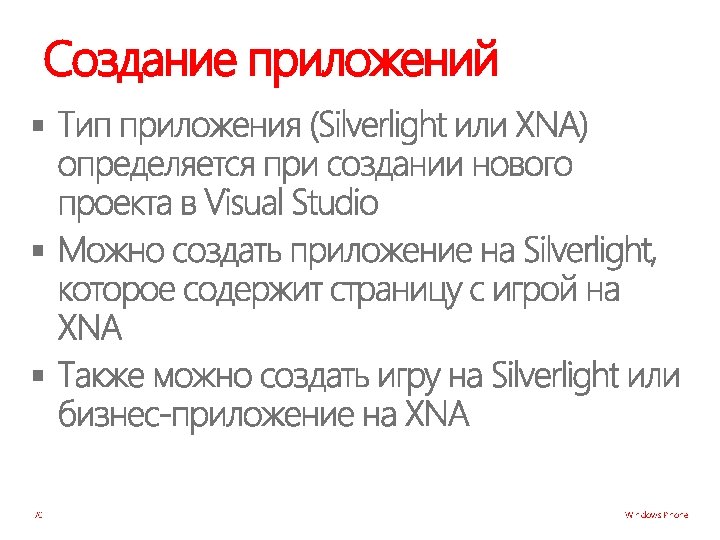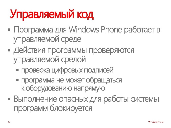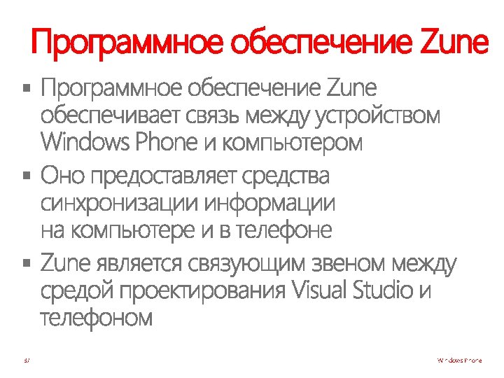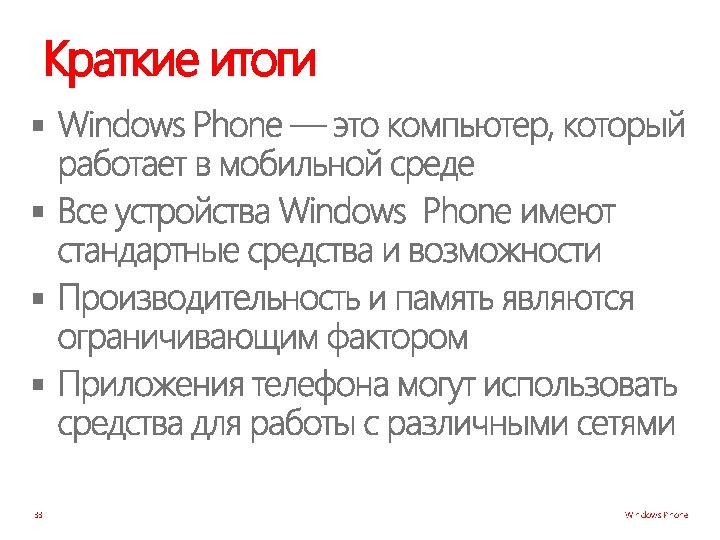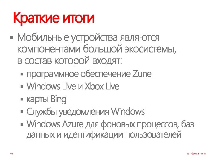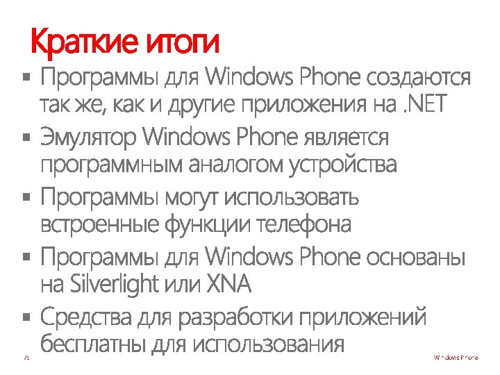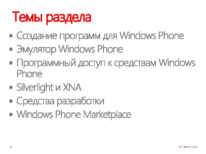 Windows Phone 5 Windows Phone 17 Windows Phone Slides: 76 Download presentation Процессор Windows Phone § § § 5 Windows Phone Камера § § 17 Windows Phone Особенности платформы Windows Phone § § § 32 Windows Phone Экосистема Windows Phone § § § 36 Windows Phone Windows Live и Xbox Live § § § 38 Windows Phone Карты Bing § § § 39 Windows Phone Windows Azure § § 41 Windows Phone Программы для Windows Phone § § 51 Windows Phone Microsoft. NET § § § 52 Windows Phone Создание программ для Windows Phone § § § 61 Windows Phone Эмулятор Windows Phone § § § 62 Windows Phone Silverlight и XNA § § § 67 Windows Phone Приложения Silverlight § § 68 Windows Phone Приложения XNA § § § 69 Windows Phone Windows Phone Marketplace § § 72 Windows Phone Правила Marketplace § § 73 Windows Phone