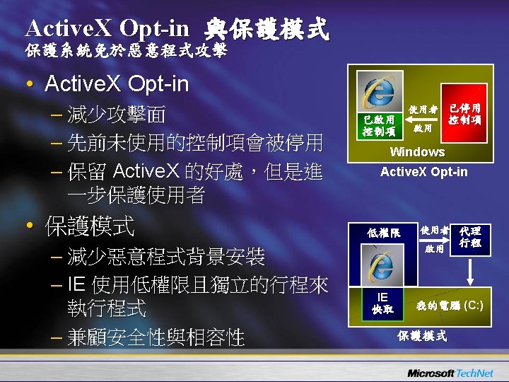 Broker Process I n te g r i ty C o n tr o l Protected Mode Internet Explorer Compat Redirector 以最低權限執行的保護模式 Admin Rights Access Install an Active. X control HKLM HKCR Program Files Change settings, User Rights Access HKCU My Documents Save a picture Cache Web content Startup Folder Temp Internet Files Untrusted files and settings Redirected settings and files