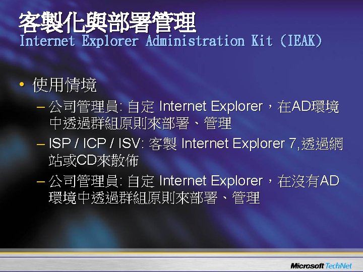 ITPro Life Cycle Pre Installation “Application Compatibility Toolkit” Customization “Internet Explorer Administration Kit (IEAK) 7” Deployment Troubleshooting / Diagnostics “RIES - Reset Internet Explorer Settings” Manageability “Improvements in Group Policy in Internet Explorer 7”