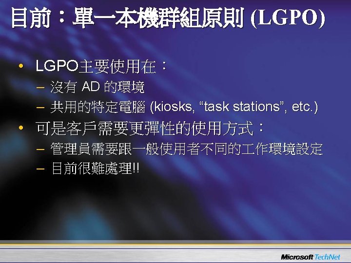 Windows Vista: 多重 LGPOs • LGPO 與 AD GPO 套用順序與優先權沒有變動 (AD GPOs 依然有較高套用權) • LGPOs 可以建立在: – The machine – NEW: Admin or non-Admin local groups – NEW: Individual local users • 套用順序依舊!(machine LGPO 先處理……) – 個別使用者的 GPO “wins” • 單一使用者依然會套用相關群組的LGPO (Admins or the Non-Admins, not both) • 新的原則設定: 排除(Exclude)使用所有的 LGPOs