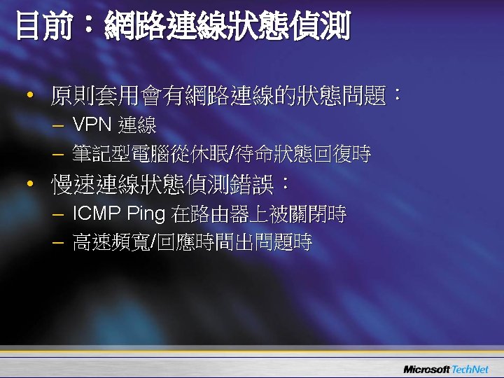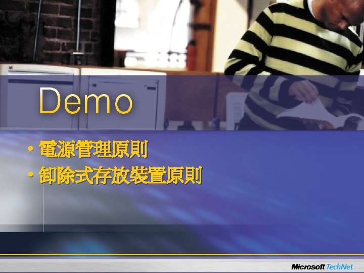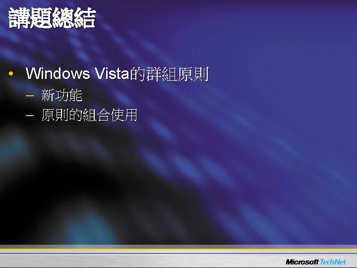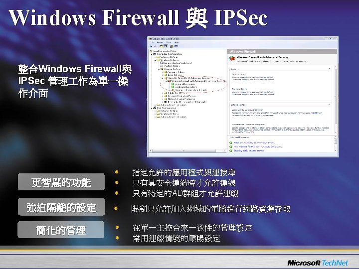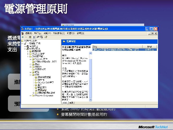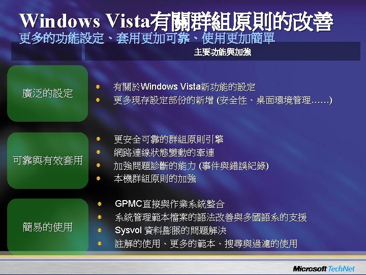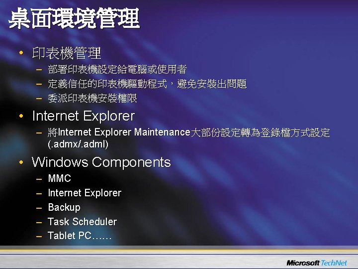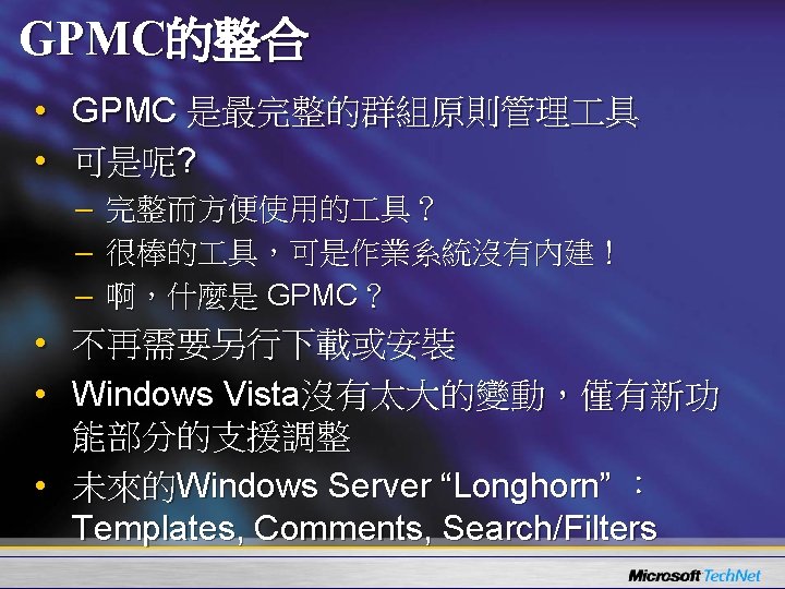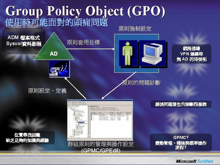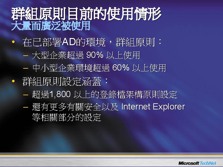 群組原則設定的組合 • 目前有1, 800+ 原則設定,Windows Vista將超過 2, 400 – 作業系統功能的大量支援 – 群組原則是Windows平台管理的基礎 Some examples: Removable Storage Devices IPSec / Windows Firewall Windows Defender Network Access Protection User Account Control Wired and Wireless Policy Power Management Internet Explorer Desktop Shell Printer Management Troubleshooting & Diagnostics Tablet PC Windows Error Reporting Globalization Remote Assistance