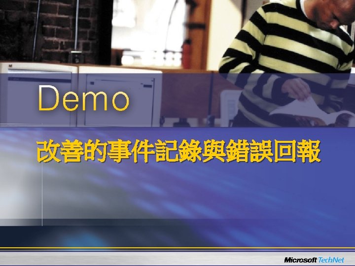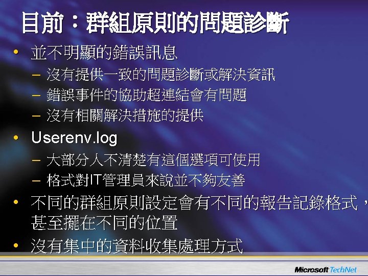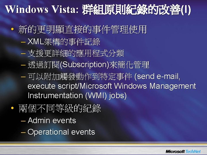 Windows Vista: 群組原則紀錄的改善(II) • Admin events – Actionable set of events in “系統”紀錄的相關部分 (source = ‘Group Policy Service’ not ‘Userenv’) – 可連結 Microsoft Web site 來取得更多相關資訊 • Operational events – Step-by-step 原則處理事件,位於”Group Policy” 應用程式紀錄 – 用來取代 Userenv. log – 單一原則更新處理過程會記錄到單一事件 ID 來群組所有 事件 – 提供有用的資訊,如Username, GPO 清單, 原則套用的 參數(total time, individual extension processing time, etc. )