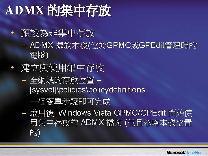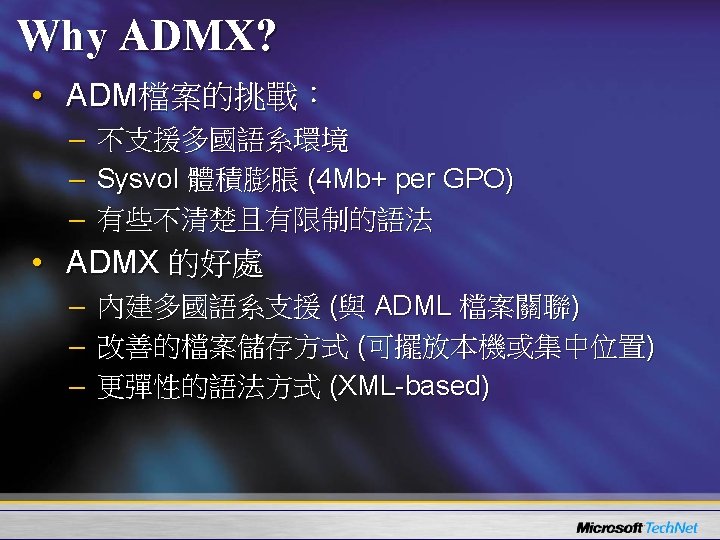Windows Vista 共存使用情形 (ADMX/ADM 並存) • Windows Vista 未包含任何的 ADM 檔 (ADMX 檔已涵蓋原來的 ADM 檔) • ADMX and ADM files 可以同時共存使用 – 用“新增/移除範本”來新增 ADM 檔(非 ADMX 檔). • Note: No plan to ship ADM to ADMX conversion tool