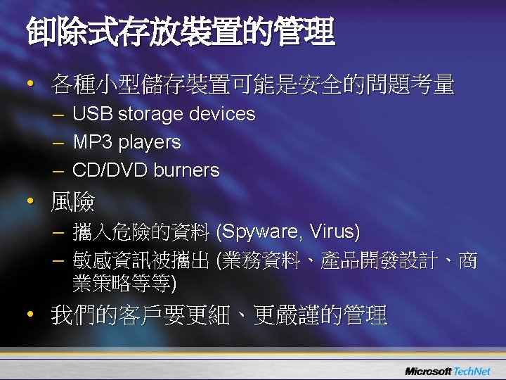 卸除式存放裝置原則設定 Removable storage device Policy Settings • 可依“電腦”或“使用者”來分別設定原則控管, 管理可依“read”或“write”來處理 • 卸除式存放裝置分類 – – – CD/DVD Tapes USB plug-in devices Windows Portable Devices (WPD) All other external removable storage devices