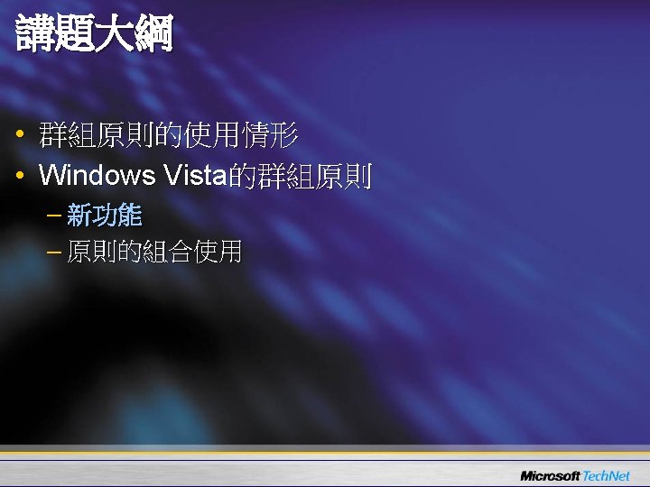 Windows Vista 群組原則新增功能 謝合宜 微軟特約技術顧問 MCSE : Security/Messaging MVP/MCT