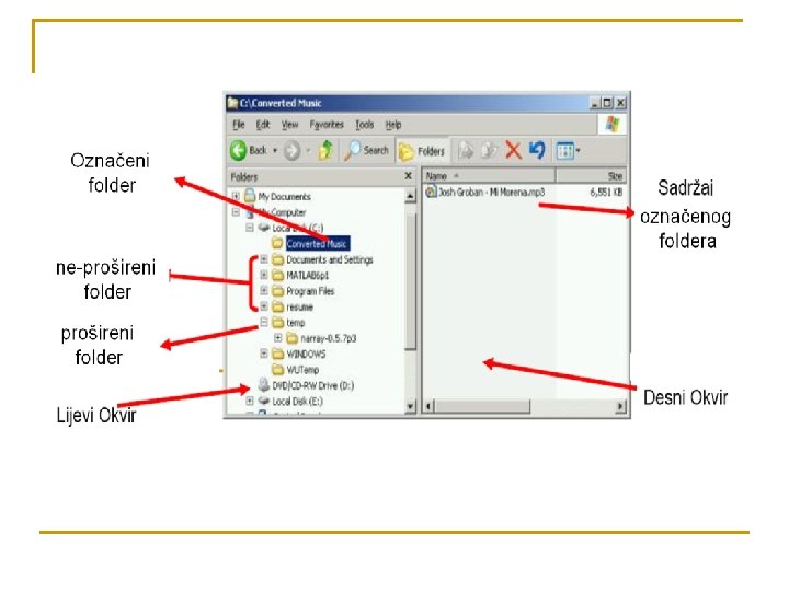 n n Program ima 2 okvira: Lijevi okvir služi za prikazivanje diskova i foldera. q q q n Znak + pored ikone diska ili foldera znači da sadrži podfolder. Klikom na znak + vrši se ekspanzija svih podfoldera u lijevom okviru Klikom na ime foldera otvara se sadržaj u desnom okviru Desni okvir služi za prikazivanje sadržaja foldera selektiranog u lijevom okviru