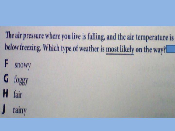 High Pressure Ok, High Pressure is 1. Dense (heavy) 2. Cool 3. Creates Clear Skies AHHHH! High Pressure