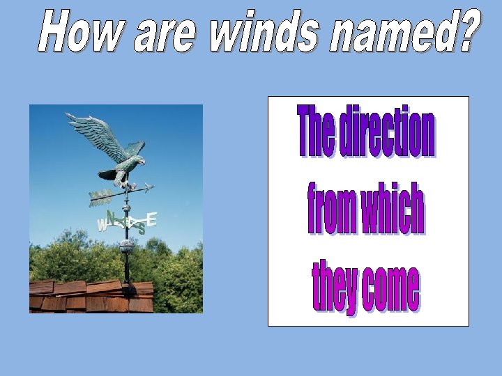 Names of Winds • IMPORTANT: Winds are named from the direction they come. • North winds comes from the north; south winds come from the south. • Southeast winds come from the southeast and blow northwest; • Northeast winds come from the northeast and blow to the southwest.