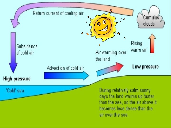 Sea Breeze any wind that blows from a large body of water toward or onto a landmass Land Breeze is the reverse effect: dry land also cools more quickly than water and, after sunset a sea breeze dissipates and the wind instead flows from the land towards the sea