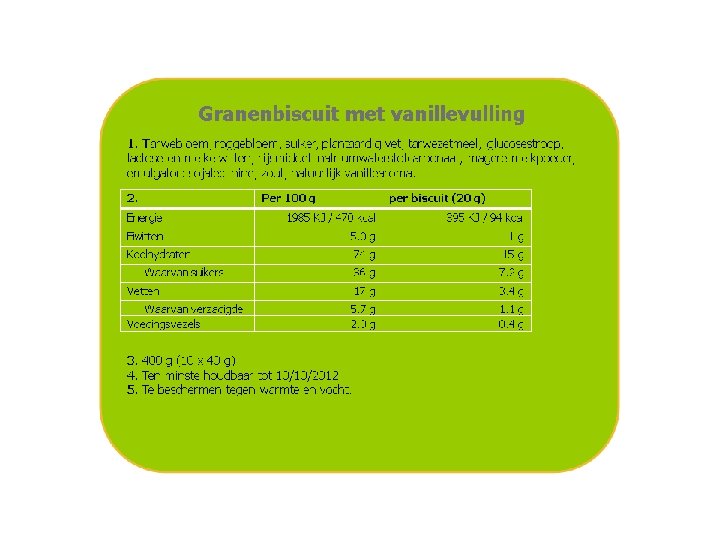 2. Voedingswaarde • Wat? Hoeveelheid energie en voedingstoffen die het product bevat per 100 g (voor vaste stoffen) of per 100 ml (voor vloeistoffen). – Energie: uitgedrukt in kilocalorieën (kcal) of kilojoule (k. J). – Koolhydraten: je hebt enkelvoudige koolhydraten (suikers) en meervoudige koolhydraten (zetmeel). – Vetten kan je onderverdelen in verzadigde (de slechte) en onverzadigde (de goede) vetten. • Aandacht! Soms wordt in een extra kolom ook de voedingswaarde per portie weergegeven.