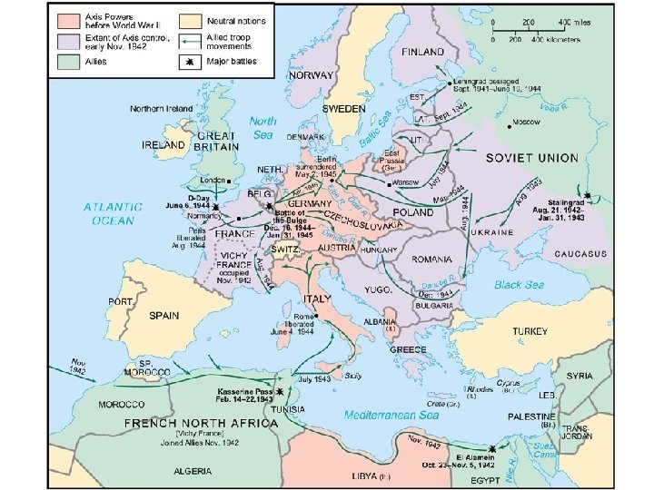 Battle of Stalingrad – (July 1942 – Feb. 1943) • • Over half a million German soldiers were killed, nearly 1 million Soviet soldiers died another half million Soviet citizens were killed. It was the bloodiest battle in the war. • Stalingrad was a major industrial city that supplied much of the western Soviet Union with petroleum from the Caucasus. The battle lasted for over 6 mos. Germany bombed the city and destroyed over 90% of the buildings. Civilians inside the city were encouraged to pick up weapons and fight against the invading Germans. The fighting went back and forth with the Germans nearly capturing the strategic city. The use of individual assault rifles and tanks played significant roles in the fighting. The Germans were then pushed back and never again threatened any major Soviet cities.
