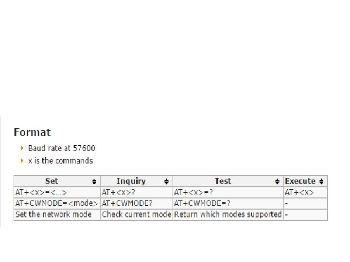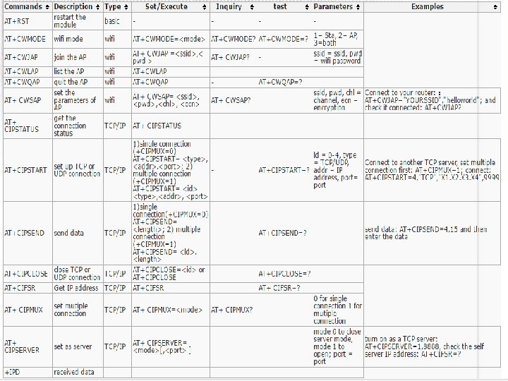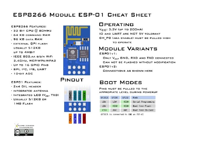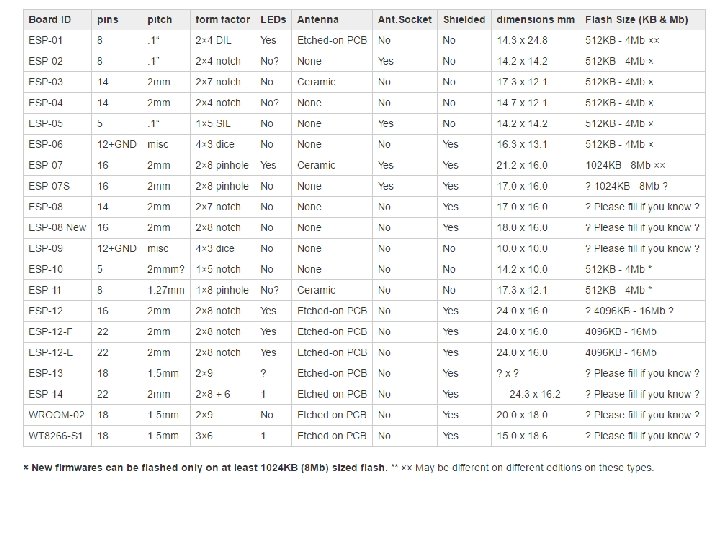 ESP 8266 Features • • • • The ESP 8266 is a low-cost Wi-Fi chip with full TCP/IP stack and MCU (Micro Controller Unit) capability 32 -bit RISC CPU: Tensilica Xtensa LX 106 running at 80 MHz* 64 KB of instruction RAM, 96 KB of data RAM External QSPI flash - 512 KB to 4 MB* (up to 16 MB is supported) IEEE 802. 11 b/g/n Wi-Fi Integrated TR switch, balun, LNA, power amplifier and matching network WEP or WPA/WPA 2 authentication, or open networks 16 GPIO pins SPI, I²C, I²S interfaces with DMA (sharing pins with GPIO) UART on dedicated pins, plus a transmit-only UART can be enabled on GPIO 2 1 10 -bit ADC * Both the CPU and flash clock speeds can be doubled by overclocking on some devices. CPU can be run at 160 MHz and flash can be sped up from 40 MHz to 80 MHz. Success varies chip to chip.