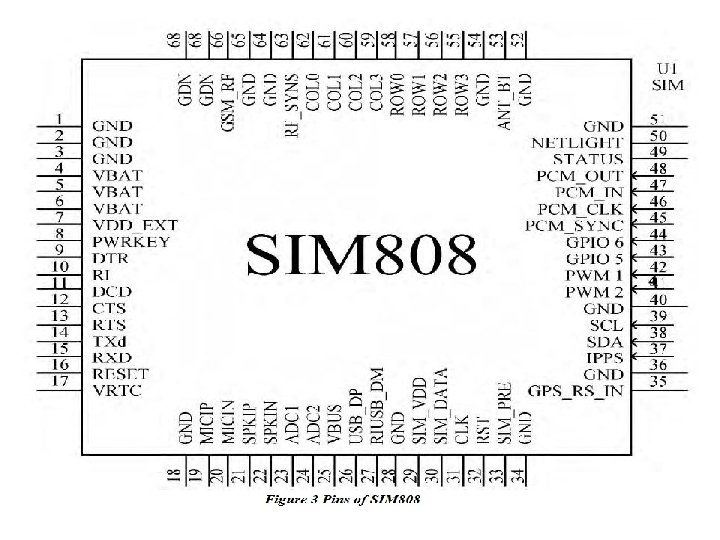 Pin Map • • PWR: this is soft power switch for the module, you can pull it to high level for at least 2 s to power up or power down the module. RI: this pin will tell you whether the module is on and is there any calls and messages received. It will be pulled to high level when the module is on. And it will change to low for 120 ms when a call or message is received. RST: this is reset pin for the module. By default it has a high pull-up. If you absolutely got the module in a bad space, you can pull it to low level for 100 ms to perform a hard reset. RXD / TXD: Serial port, the module uses it to send and receive commands and data. TXD is output, and RXD is input. They can be connected to the 3. 3 V and 5 V level. VIO: this is the reference logic level for serial port of the module, the input voltage depends on the logical level of the microcontroller you use. If you use a 5 V microcontroller like Arduino, you should have it be 5 V, and a 3 V logic microcontroller you should set it to 3 V. BAT: this pin is connected to Li-Ion battery pin, if you want to use only one Li-Ion battery as your power supply, you can use it to drive you microcontroller. DTR: this is wake up pin for module in sleep mode. By default it has a high pull-up, and you can set the module into sleep mode by AT command “AT+CSCLK=1”. In the meantime, the serial port will be disabled. The serial port will be active after DTR pin is pulled to low level for about 50 ms.